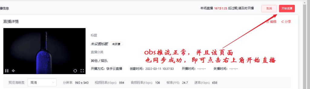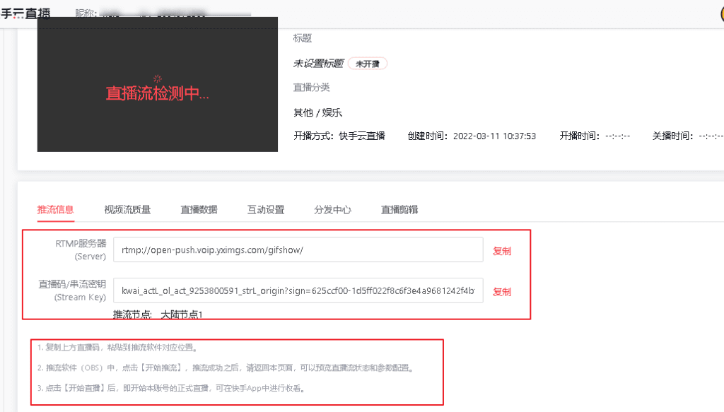 教你如何查看快手推流码地址-无需借助抓源软件 By admin | 2022年3月11日 0 Comment步骤:浏览器打开快手创作者平台 点击前往 页面如图 点击左侧栏的创建直播出现如下界面,直播方式设置选推流直播,然后根据自己的情况填写相应的信息,接着点击最下面的创建直播点击查看创建号的直播信息,进入以下页面 ,这时候就可以看到推流信息了。把推流信息复制到你的推流工具即可OBS设置好要开播的媒体源后,点击开始推流,下面是推流及快手推流码页面同步如图同步成功后别忘了点击开始直播,不然你app仍然是未开播状态,如下图
